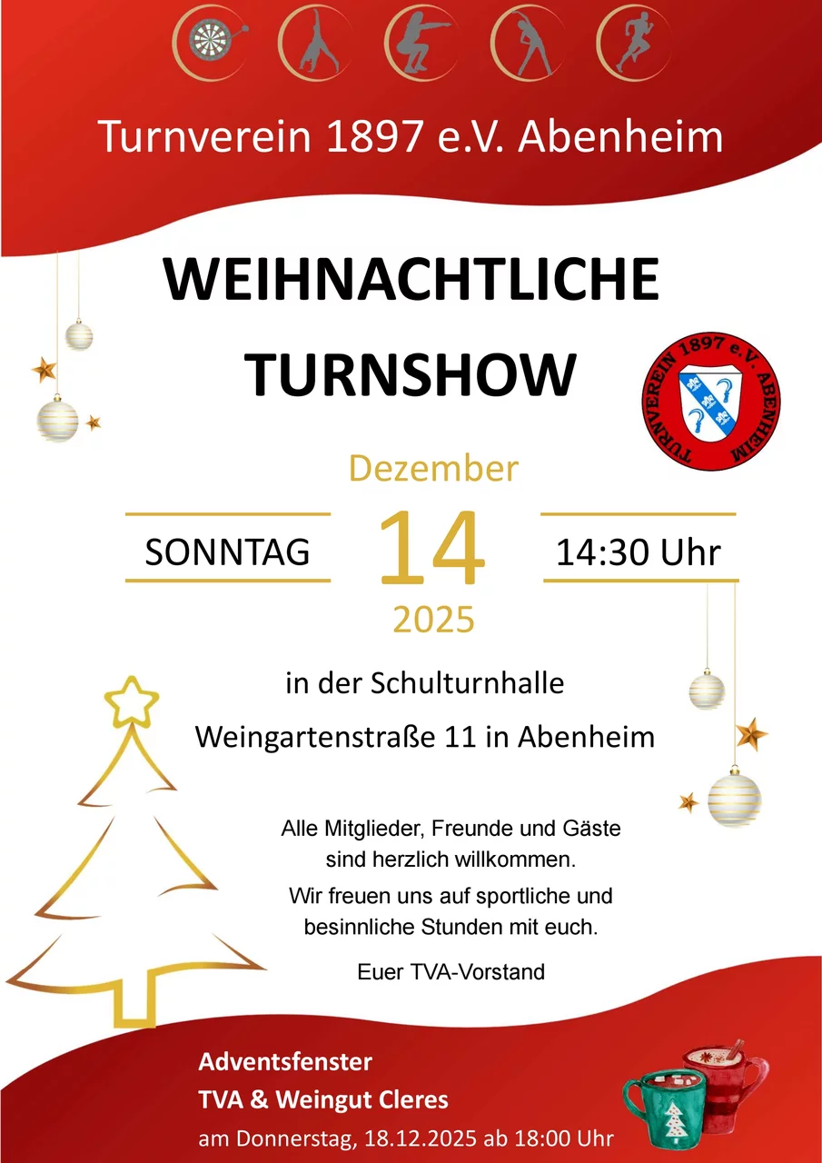 Der Turnverein Abenheim lädt alle Mitglieder zur Mitgliederversammlung am Montag, dem 24. März, um 19 Uhr im Weingut Cleres, Wonnegaustraße 59, ein. Die vollständige Agenda zum Download finden Sie hier.